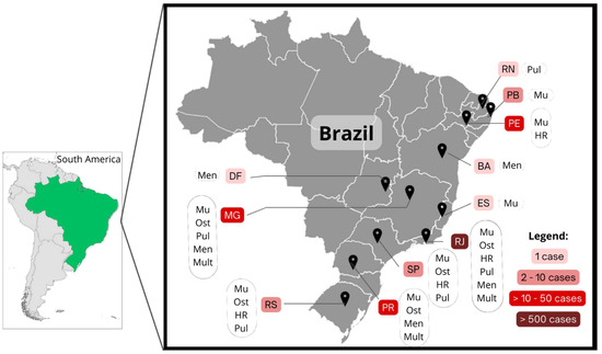 Cases were grouped and analyzed in each category (HRs, mucosal, osteoarthritis, pulmonary, meningeal) regarding sex, age, dispersion in time and location, primary site of infection and sites of dissemination, presence of comorbidities, and outcome. Data compilation and analyses were performed with the Excel software (2013 version, Microsoft Corporation®, Redmond, WA, USA). Geographical analyses were performed using Google Maps (https://maps.google.com/, accessed on 28 February 2024) (Google®, Mountain View, CA, USA) superimposed on a world map, generating a Geographic Information System (GIS). QGIS software version 3.30.0 (Open Source Geospatial Foundation—OSGeo, Anchorage, AK, USA) was used to analyze the geographical distribution of cases.