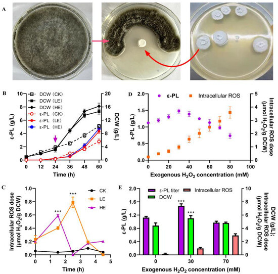 B. cinerea cultivation was carried out in a 500 mL flask with 80 mL working volume at 22 °C and 180 rpm for 4 days. The biomass was sequentially treated by centrifugation (5000× g), twice with water-rinsing, suspension in 70% ethanol, grinding in mortar with quartz sand, and centrifugation (5000× g). The supernatant was sterilized at 115 °C for 15 min and added in the ε-PL production as a mixture of B. cinerea elicitors at 24 h, after which the intracellular ROS dose was measured. The culture groups were set as CK (control check, 0 g wet cell/liter addition), LE (low dose of elicitors, 36 g wet cell/liter addition), and HE high dose of elicitors (72 g wet cell/liter addition).
