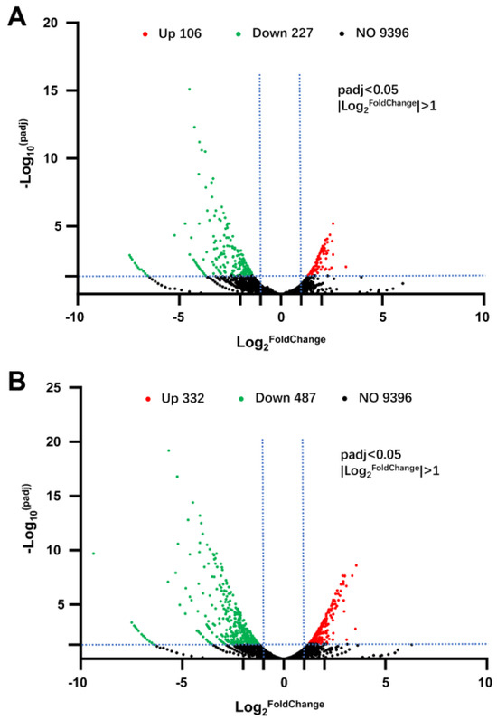 Interaction between Volcano diagrams showing the number of differentially expressed genes influenced by ROS induction. (A) LOS vs. CK; (B) HOS vs. CK. Up: upregulated DEGs, higher expression after intracellular ROS elevation; Down: downregulated DEGs, lower expression after intracellular ROS elevation; NO: no significant transcriptional difference after intracellular ROS elevation. The data are filtered under the standard of padj < 0.05 and |log2(foldchange)| > 1. The dashed line demarcates the genes exhibiting down-regulation, up-regulation, and no significant change in expression.