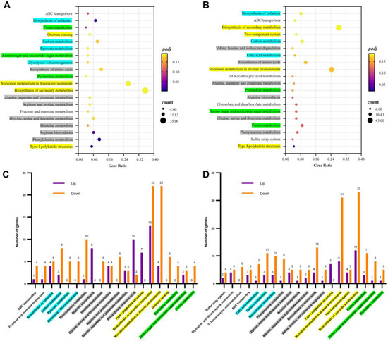 Influences of ROS on genes enriched in KEGG pathways (padj ≤ 0.05). Top 20 significantly enriched KEGG pathways in LOS vs. CK (A) or HOS vs. CK (B), in which the coordinate position and size of the dots (in A,B) indicate the ratio of DEGs and gene count involved in the KEGG term, and the color (in A,B) represents the p-value. Significantly enriched KEGG pathways in LOS vs. CK (C) and HOS vs. CK (D), in which the numbers of differentially expressed genes were summarized as Up (upregulated DEGs) and Down (upregulated DEGs) in different colors.