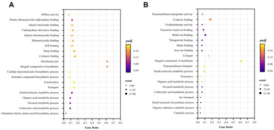 Top 20 significantly enriched Gene Ontology terms (padj ≤ 0.05) in LOS vs. CK (A) and HOS vs. CK (B), in which the coordinate position and size of the dots indicate the ratio of DEGs and gene count involved in the KEGG term, respectively, and the color represents the padj-value.