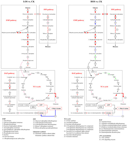 The synthesis of ε-PL is highly reliant on the metabolic activities of the embden meyerhof pathway (EMP), pentose phosphate pathway (PPP), TCA cycle, and diaminopimelic acid pathway (DAP) [29]. To gain a comprehensive understanding of this phenomenon’s effects on key gene transcription within these pathways, the effects were summarized and analyzed (Table S2 and Figure 5).