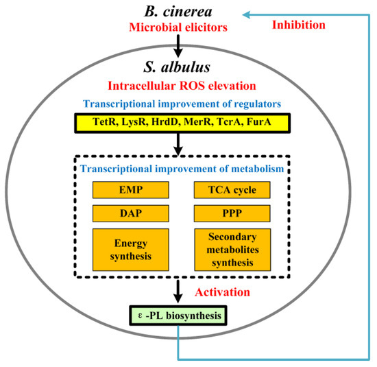 The present study demonstrated that ROS functioned as an intracellular secondary signal mediating the induction of B. cinerea elicitors and efficient ε-PL production. The microbial call from B. cinerea triggered a controlled elevation of ROS levels in cells, which positively influenced the biosynthesis of ε-PL. Despite the downregulation of the majority of gene transcription by elevated ROS, an optimal dose of ROS induced global transcriptional promotion in key pathways involved in ε-PL biosynthesis, including the EMP, the PPP, the TCA cycle, the DAP, ε-PL accumulation, cell respiration, and energy synthesis. This global regulation involved Sigma factor HrdD and transcriptional regulators TcrA, TetR, FurA, and MerR. These findings provided valuable insights into the interaction mechanisms between molds and Streptomyces species, with significant implications for industrial ε-PL production and biocontrol strategies against gray mold disease.