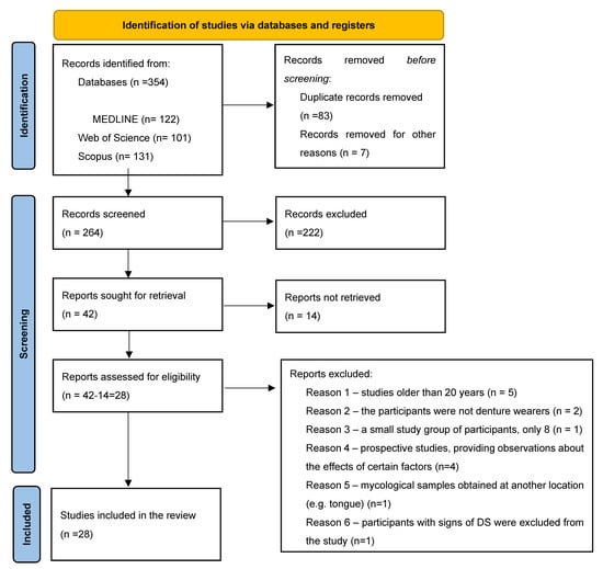 Twenty-eight studies were included in the systematic review [2,18,21,22,28,29,30,31,32,33,34,35,36,37,38,39,40,41,42,43,44,45,46,47,48,49,50]. Twenty-one studies investigated DS [2,18,21,22,28,29,30,31,32,33,34,35,36,37,38,39,40,41,42,43,44], while seven studies [45,46,47,48,49,50,51] examined Candida colonization in patients using removable dentures.
