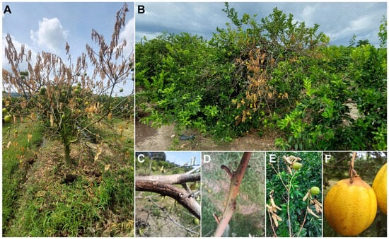 Symptoms caused by Lasiodiplodia spp. on Citrus latifolia (Persian lime) in southern Mexico. (A) Tree showing defoliation and tree decline. (B) Tree exhibiting dieback of twigs and branches. (C) Sunken canker on branch. (D) Twig dieback. (E) Branch dieback. (F) Fruit mummification.
