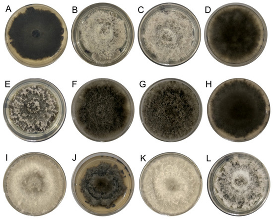 Lasiodiplodia culture grown on PDA at 25 °C for 7 days. (A) IXBLT3, L. lignicola. (B) IXBLT4, L. pseudotheobromae. (C) IXBLT5, L. pseudotheobromae. (D) IXBLT6, L. pseudotheobromae. (E) IXBLT7, L. theobromae. (F) IXBLT9, L. theobromae. (G) IXBLT10, L. theobromae. (H) IXBLT12, L. pseudotheobromae. (I) IXBLT14, L. iraniensis. (J) IXBLT15, L. mexicanensis. (K) IXBLT16, L. iraniensis. (L) IXBLT18, L. pseudotheobromae.