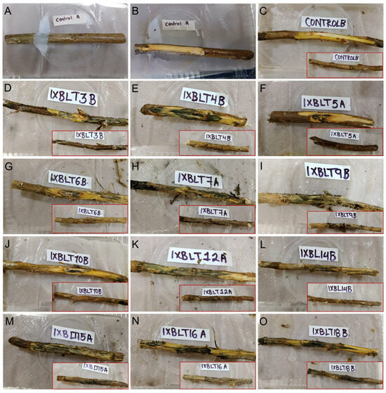 Pathogenicity test on detached branches of Persian lime. (A–C) Negative controls inoculated with fresh, noncolonized PDA plugs. (D) IXBLT3 strain of L. lignicola. (E–G) IXBLT4, IXBLT5, IXBLT6 strains of L. pseudotheobromae. (H–J) IXBLT7, IXBLT9, IXBLT10 strains of L. theobromae. (K) IXBLT12 strain of L. pseudotheobromae. (L) IXBLT14 strain of L. iraniensis. (M) IXBLT15 strain of L. mexicanensis. (N) IXBLT16 strain of L. iraniensis. (O) IXBLT18 strain of L. pseudotheobromae. Red boxes show the detached branch before the bark was removed.