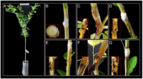 Pathogenicity test on 18-month-old Persian lime plants from certified nursery. (A,B) Negative controls inoculated with fresh, noncolonized PDA plugs. (C) IXBLT3 strain of L. lignicola. (D) IXBLT9 strain of L. theobromae. (E) IXBLT12 strain of L. pseudotheobromae. (F) IXBLT14 of L. iraniensis. (G) IXBLT15 of L. mexicanensis. Red boxes show the stem with the bark removed.