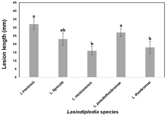 To determine the virulence, the lesion lengths caused by the most aggressive strain of each Lasiodiplodia species from two independent experiments on certified nursery Persian lime plants were averaged (Figure 6). There were significant differences in internal necrosis length produced by the different Lasiodiplodia species (p < 0.05). The longest mean lesions were produced by L. iraniensis, followed by L. pseudotheobromae and L. lignicola, which were the most virulent species. On the other hand, shorter mean lesions were induced by L. theobromae and L. mexicanensis, which were considered the least virulent species.