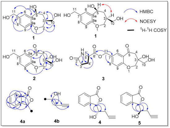 The key HMBC (blue) and NOESY (red) correlations of 1–5.