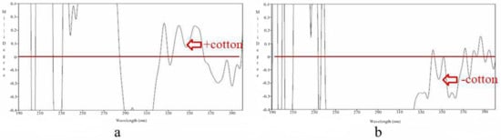 The CD spectrum of compounds 1–2 in CH3OH. (a) The CD spectrum of compound 1 after complexation with metal rhodium salt; the spectrum showed that there was a positive Cotton effect at 350 nm. (b) The CD spectrum of compound 2 after complexation with metal rhodium salt; the CD spectrum showed that there was a negative Cotton effect at 350 nm.
