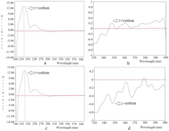 The relative structure of compound 1 could be determined by analyzing its NOESY correlation spectrum (Figure S4). H-5 was correlated with H-3 in the NOESY spectrum; therefore, H-3 and H-5 were on the same side. After complexation with a metal rhodium salt, the absolute configuration of C-5 was elucidated by the CD spectrum (Figure 3). According to the bulkiness rule, there was a positive Cotton effect at 350 nm [32,33]; hence, C-5 was elucidated as S. Combined with the relative configuration; C-3 was S-type.
