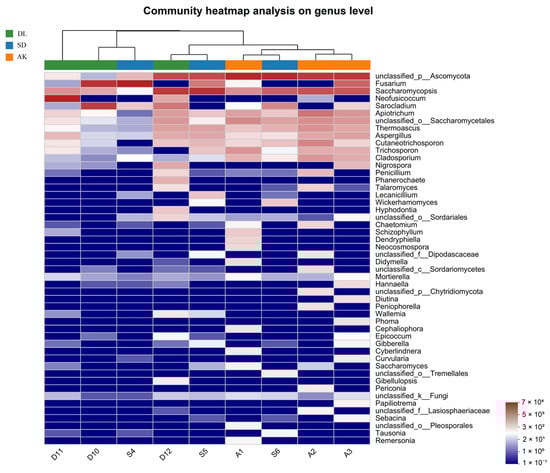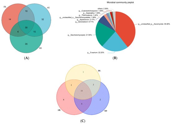 Five genera emerged as prevalent across the samples: Fusarium, Cladosporium, Nigrospora, Beauveria, and Penicillium, with relative frequencies of 23.34%, 21.13%, 11.23%, 6.21%, and 5.22%, respectively. Nevertheless, there were slight variations in dominance patterns across the different sites. In AK, the most common genera were Nigrospora (22.65%), Beauveria (17.8%), and Fusarium (9.65%). In the SD site, the predominant genera were Fusarium (47.15%), Cladosporium (12.25%), and Penicillium (8.69%), while in the DL site, the predominant genera were Cladosporium (33.24%) and Fusarium (19.84%) (Figure 2A).