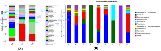 The relative abundance of corn grain EFs at the genus level. (A) Culture-dependent EF; (B) culture-independent EF. The fungi with a relative abundance less than 0.1% were grouped as ‘others’. A1–A3 = AK; S4–S5 = SD; D10–D12 = DL.