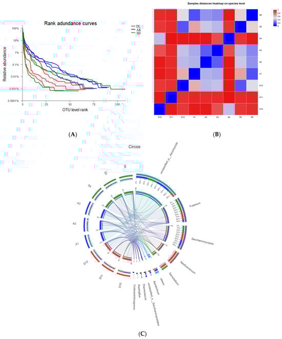 The diversity of culture-independent corn grain EFs between contaminated and non-contaminated sites. (A) The rank curve is based on OTU abundance. (B) The beta diversity heatmap is based on the unweighted UniFrace distance. (C) Circos graph. Different colors indicate differences in species diversity among the samples. A1–A3 = AK; S4–S5 = SD; D10–D12 = DL.