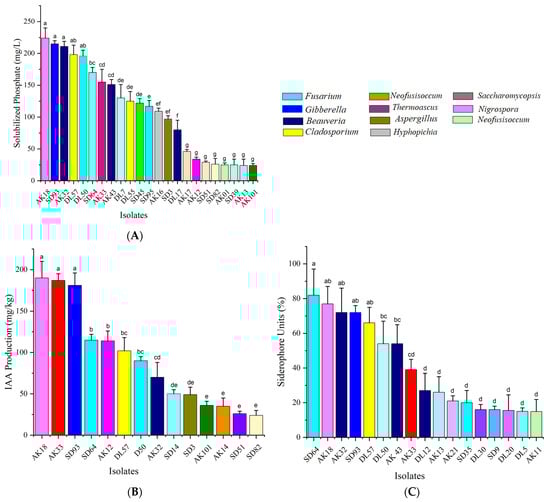 (A) Phosphorus solubilization; (B) IAA production; (C) siderophore production of corn grains EFs. Different colors represent distinct genera, while identical colors denote the same genus. Different letters in each column denote that mean values are significantly different (p < 0.05), means ± SDs (n = 3).