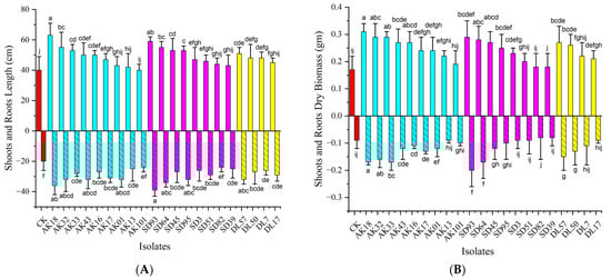 (A) Relative length and (B) relative biomass of shoots and roots of Zea mays inoculated with different isolates. The red bars represent CK, while the cyan, magenta, and yellow bars represent AK, SD, and DL respectively. Different letters in each column denote that mean values are significantly different (p < 0.05), means ± SDs (n = 9).