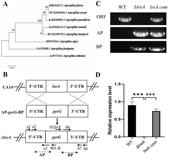 LreA identification and mutant strain construction. (A) Phylogenetic tree of LreA homologous proteins from various fungi. The phylogenetic tree was constructed using MEGA 7.0 with protein sequences, as shown. (B) A typical schematic description of lreA disruption. UTR represents the untranslation region. AP and BP represent the A and B homology arm parts, respectively. (C) lreA mutant strains were verified with PCR. WT means wild-type, and ORF represents the open reading frame of the lreA gene. (D) The expression of lreA was determined through qRT-PCR in different A. flavus strains. *** represents significant difference (p < 0.001).