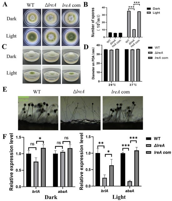 The role of lreA in conidiation and hyphal growth. (A) The growth morphology of WT, ΔlreA, and lreA-com strains on PDA. (B) The comparison of the conidia number in WT, ΔlreA, and lreA-com. *** represents significant difference (p < 0.001). (C) The side observation of WT, ΔlreA, and lreA-com strains’ growth on PDA. (D) The comparison of substrate mycelium growth in WT, ΔlreA, and lreA-com. (E) Conidiophore morphology of WT, ΔlreA, and lreA-com on PDA. (F) The expression of brlA and abaA in WT, ΔlreA, and lreA-com. * represents significant difference (p < 0.05), ** represents significant difference (p < 0.01), and *** represents significant difference (p < 0.001). ns, no significance.