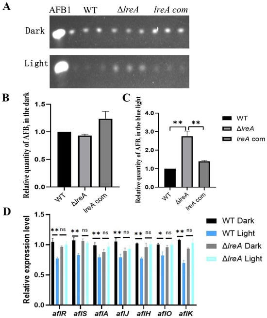 To study the role of LreA in the biosynthesis of AFB1, aflatoxin levels were assayed in ΔlreA and control strains (WT and lreA-com) under dark and light conditions. As shown in Figure 3A,B, no significant difference was detected in ΔlreA or control strains in the dark. In contrast, the levels of AFB1 in ΔlreA were significantly higher than in the WT strain in the blue light (Figure 3C), indicating that LreA inhibited AFB1 synthesis in the blue light, which suggested that the inhibiting signal of blue light had not been sensed in ΔlreA. To further investigate the reason why AFB1 decreased in ΔlreA, the expression of key genes in AFB1 biosynthesis was examined using qPCR. As shown in Figure 3D, compared to the dark condition, the expression levels of genes, such as aflA, aflJ, aflH, aflO, and aflK, involved in AFB1 biosynthesis were significantly decreased in the WT strain under blue light, indicating that decreased AFB1 levels were due to the inhibited expression of AFB1 biosynthesis genes under light. In contrast, this decrease in AFB1 levels and related genes was not observed in ΔlreA (Figure 3D). These data suggested that LreA was responsible for sensing the blue light and mediated the inhibiting effect of AFB1 biosynthesis by downregulating the key genes for AFB1 biosynthesis in A. flavus.