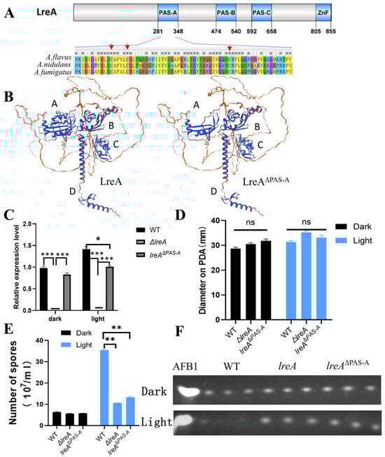 LreA mainly contains three PAS domains (PAS-A, PAS-B, PAS-C) and a zinc finger (ZnF) domain with protein domain prediction (Figure 4A). PAS-A was believed to be responsible for the binding of flavins and for sensing the light signal [1,6]. Alignment of PAS-A (281–348 AA) indicated that the similarity of PAS-A from A. flavus is 82% and 88% compared to that from A. nidulans and A. fumigatus, respectively, indicating that PAS-A is conserved during LreA evolution. The cysteines, which were candidates to form adducts with flavins [2,19], and the neighboring amino acids were conserved in three blue light receptors of A. flavus, A. nidulans, and A. fumigatus (Figure 4A). Four typical domains (A, B, C, and D) were clearly observed in the structure modeling (Figure 4B), and the absence of PAS-A disrupts the structure of domain A, which may abort the function of LreA. To explore the function of the PAS-A domain, a PAS mutant (lreAΔPAS-A) was constructed in this study, which was confirmed with PCR and specific region sequencing in the genome. Interestingly, the expression of lreA was stimulated under blue light in the WT strain, while lreAΔPAS-A lost the ability to respond to blue light (Figure 4C). Compared with the WT strain, the blue light has no effect on the growth of substrate mycelium in lreAΔPAS-A (Figure 4D), but it impaired the development of conidia under light (Figure 4E), which was consistent with the phenomenon in ΔlreA. At the same time, the aflatoxin level was decreased in the WT due to the inhibition by blue light, but the inhibited effect of light on aflatoxin biosynthesis was relieved in lreAΔPAS-A (Figure 4F), which was similar to ΔlreA, indicating that the PAS-A domain was necessary for the normal role of LreA in A. flavus.