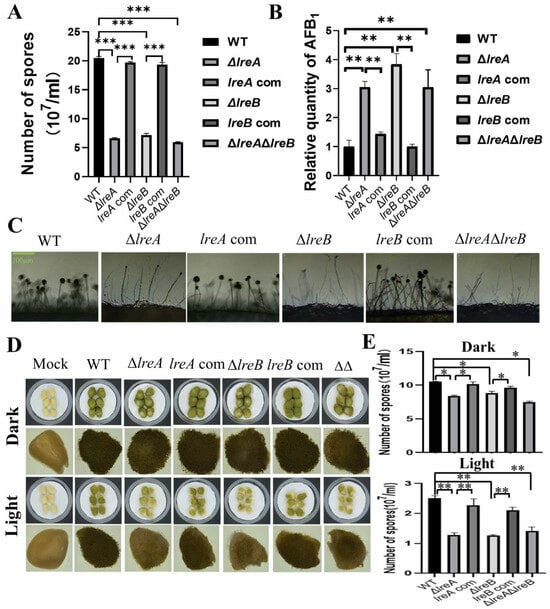 To further characterize LreA, five proteins have been predicted to interact with LreA (Table 2). The potential LreA partners with high confidence are AFLA_065850 and AFLA_051690 (Table 2), which are homologs of FphA and LreB, respectively, in A. nidulans. LreB has been reported to be the transcriptional partner of LreA, and it co-regulates the expression of many downstream genes in A. nidulans and N. crassa [6]. To disclose whether LreB is involved in the regulation of conidiation and AFB1 biosynthesis in A. flavus, ΔlreB was constructed through the same method used to construct ΔlreA, as described above. As shown in Figure 5A, abnormal development of conidia was observed in ΔlreB, as in ΔlreA. Moreover, the absence of LreB impaired the inhibiting effect of blue light on AFB1 biosynthesis (Figure 5B), suggesting that LreB is necessary for the intact effect of blue light on A. flavus mediated by LreA. The ΔlreAΔlreB double mutant confirmed the phenotype observed in ΔlreA and ΔlreB (Figure 5A–C). These results demonstrated that LreB and LreA potentially co-regulated conidiation and AFB1 biosynthesis in A. flavus.