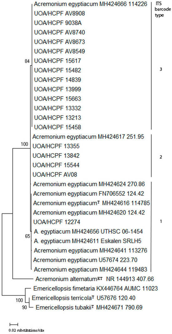 Isolates were revived on malt extract agar for 1 week and DNA was extracted as previously described [12]. Briefly, mycelia were transferred into 1.5 mL microcentrifuge tubes containing 500 mL lysis buffer (200 mM Tris-HCl, pH 8, 250 mM NaCl, 25 mM EDTA, 0.5% sodium dodecyl sulfate, all from Sigma, St. Louis, MO, USA), disrupted mechanically with an orbital homogenizer followed by an extraction with a ratio of 25 phenol (Sigma)/24 chloroform (BDH, Poole, UK)/1 isoamyl alcohol (Ferak, Berlin, Germany) and 1 h centrifugation at 4 °C at 13,000× g. The supernatant was then removed, and after a pure chloroform extraction, was precipitated with an equal volume of isopropanol (Merk, Darmstadt, Germany) at −20 °C for 15 min and centrifuged at 15,000× g for 15 min. The pellet was washed with 70% aqueous solution of ethanol, dried at room temperature, and re-suspended in sterile distilled water. The DNA extracts were stored at 4 °C until processed. Isolates were identified to genus and species level by sequencing of the whole internal transcribed spacer (ITS), comprising the whole of the ITS1 region, the 5.8S rDNA gene, and the whole of the ITS2 region. Forward primers ITS5 or ITS1 and reverse primer ITS4 were used for PCR amplification as previously described [12,13], and the conditions for 35 cycles were 1 min at 95 °C, 1 min at 58 °C, and 1 min 30 s at 72 °C. The final cycle was 1 min at 95 °C, 1 min at 58 °C, and 5 min at 72 °C. The products were directly sequenced at both directions and ITS derived sequences were compared with the GenBank-archived sequences (BLAST; http://www.ncbi.nlm.nih.gov, accessed on 18 September 2024) and were aligned with CLUSTALW [14]. GenBank-derived sequences of type and reference Acremonium egyptiacum strains (including the three recognized Acremonium egyptiacum genotypes) as per Summerbell et al. [3] were included in the alignment. Emericellopsis fimetaria, Emericellopsis terricola, and Emericellopsis tubakii were employed as the outgroup. The MEGA-X software platform (https://www.megasoftware.net/downloads/dload_win_gui, accessed on 31 July 2024) was used for deriving phylogenetic relations via the neighbor-joining method, the evolutionary distances were computed using the Kimura two-parameter method [15], and the robustness of the trees obtained was evaluated by 1000 bootstrap replications.