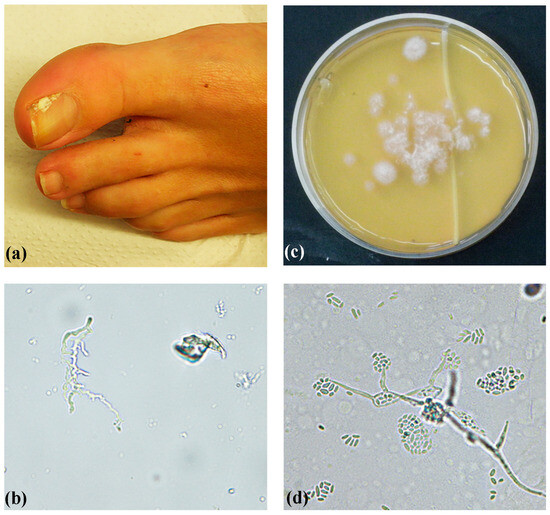 A confirmed (repeated isolation and positive direct microscopy) toenail white superficial onychomycosis case in a 40-year-old woman, caused by a type 3 Acremonium egyptiacum isolate. (a) White area on the surface of the first toenail. (b) Direct microscopy of nail clippings showing a branching hyphal structure (original magnification 400×). (c) First isolation directly from nail clippings on Sabouraud dextrose agar, showing multiple A. egyptiacum colony forming units, after incubation at 32 °C for 8 days. (d) Microscopy showing slimy heads on phialides (original magnification 400×).