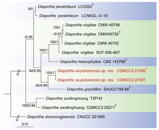 Notes: In this study, multigene phylogenetic analysis showed that Diaporthe wuyishanensis (CGMCC3.27490 and CGMCC3.27491) formed an independent clade (92% ML/0.99 PP, Figure 1) with Diaporthe grandiflori [35]. However, Diaporthe wuyishanensis distinguished from Diaporthe grandiflori by ITS and tef1 loci comparison (32/552 in ITS and 19/317 in tef1). Morphologically, the alpha conidia of Diaporthe wuyishanensis are smaller than Diaporthe grandiflori (4.3–6.5 × 1.4–2.6 vs. 6.3–8.3 × 2.8–3.3 μm), and Diaporthe grandiflori produces alpha conidia and beta conidia, whereas Diaporthe wuyishanensis appears to only produce alpha conidia. Therefore, we introduce this fungus as a new species.