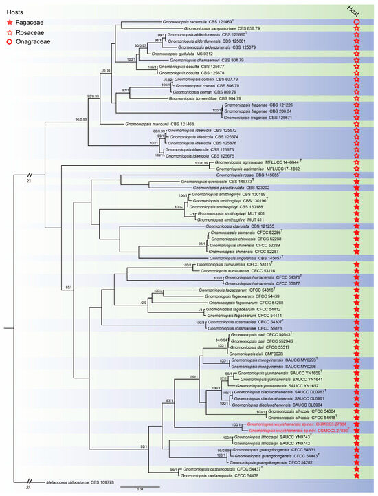 Consensus tree of Gnomoniopsis inferred from Bayesian inference analyses based on the combined ITS, tef1 and tub2 sequence dataset, with Melanconis stilbostoma (CBS 109778) as the outgroup. The Maximum likelihood (ML) bootstrap support values and Bayesian posterior probabilities (BPPs) above 80% and 0.90 were shown at the nodes. Strains marked with “T” are ex-type, ex-epitype and ex-neotype. The isolates from this study are indicated in red.