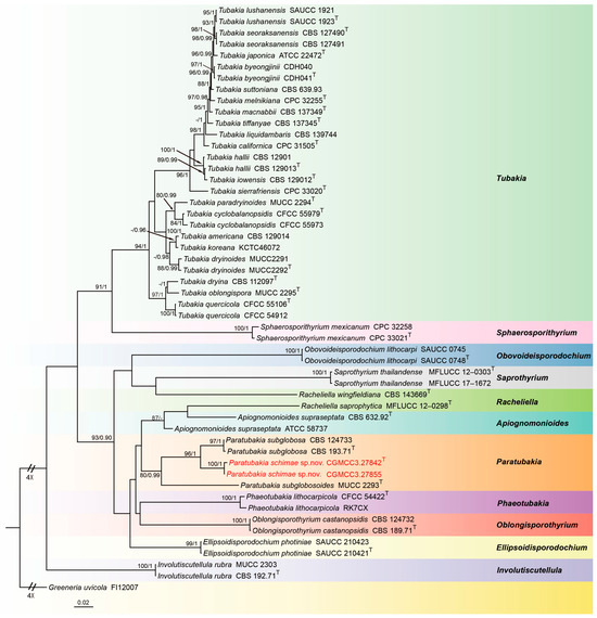 Notes: In this study, Paratubakia schimae form a well-supported (96% ML/1 PP, Figure 3) clade that is close to Paratubakia subglobosa within Tubakiaceae trees. However, Paratubakia schimae is distinguished from Paratubakia subglobosa by ITS, tef1, tub2 and rpb2 loci (24/519 in ITS, 38/569 in tef1, 19/498 in tub2 and 20/760 in rpb2) [37]. Morphologically, the conidiogenous cells of Paratubakia schimae are larger than Paratubakia subglobosa (13.0–20.5 × 4.4–5.8 vs. 8.0–12.0 × 2.0–3.0 μm). Therefore, we introduce this fungus as a new species.