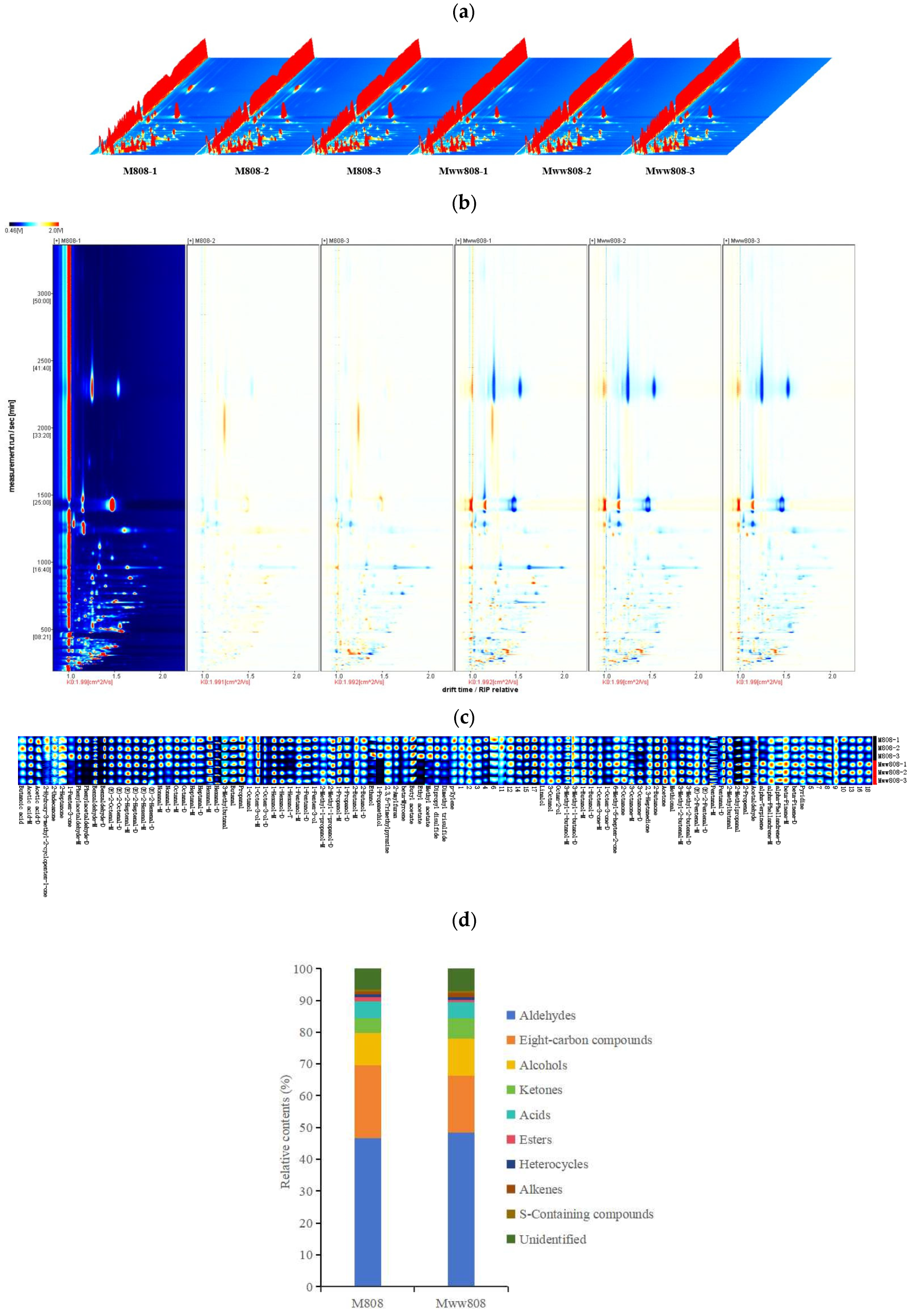 - Ma, C.; Nie, H.; Liu, L.X.; Wang, F.R.; Chen, Y.; Zhang, W.; Liu, Y.G. Gas chromatography-ion mobility spectrometry (GC-IMS) technique and its recent applications in grain research. J. Sci. Food Agric. 2024, 104, 9093–9101. [Google Scholar] [CrossRef]