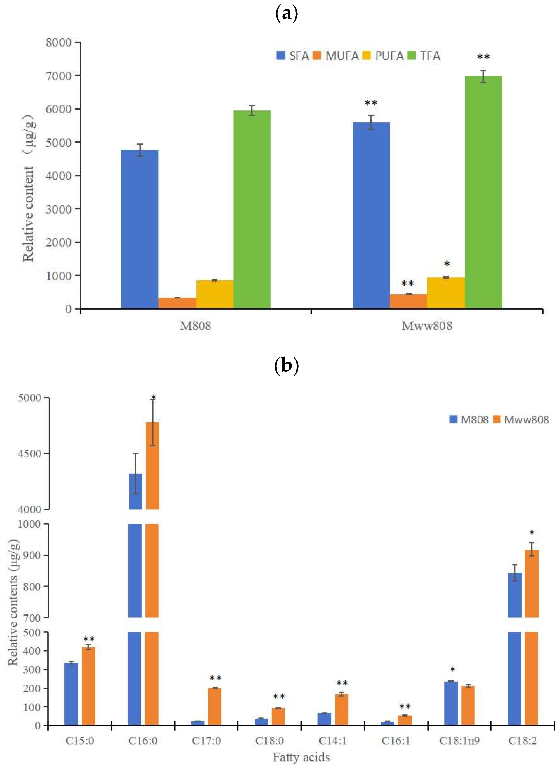 3.3. Fatty Acids Analysis in Two L. edodes Mycelia