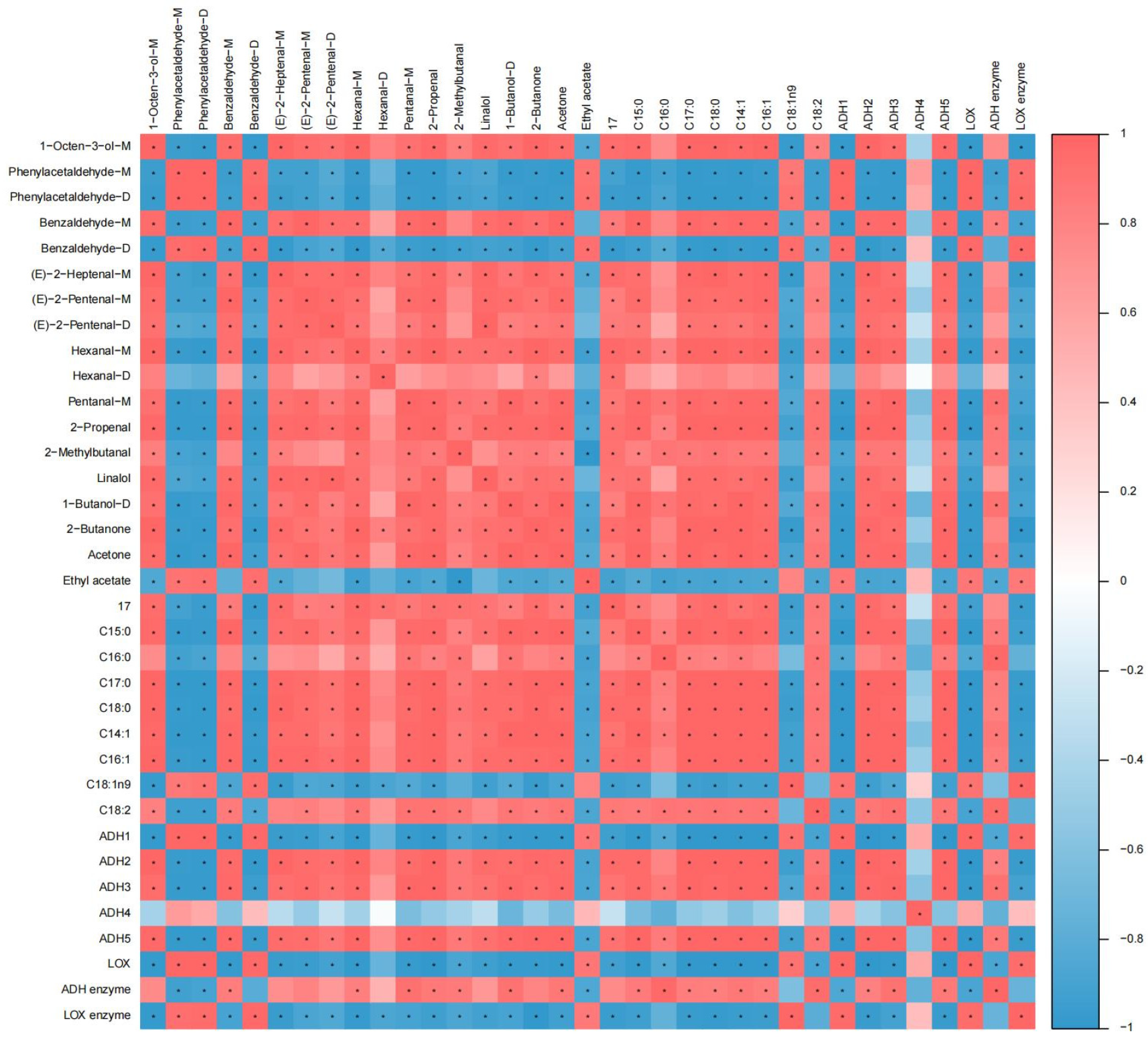 3.5. Correlation Analysis Between Aroma Compounds and Fatty Acids, LOX Pathway Related Genes, and Enzyme Activities in Two L. edodes Mycelia