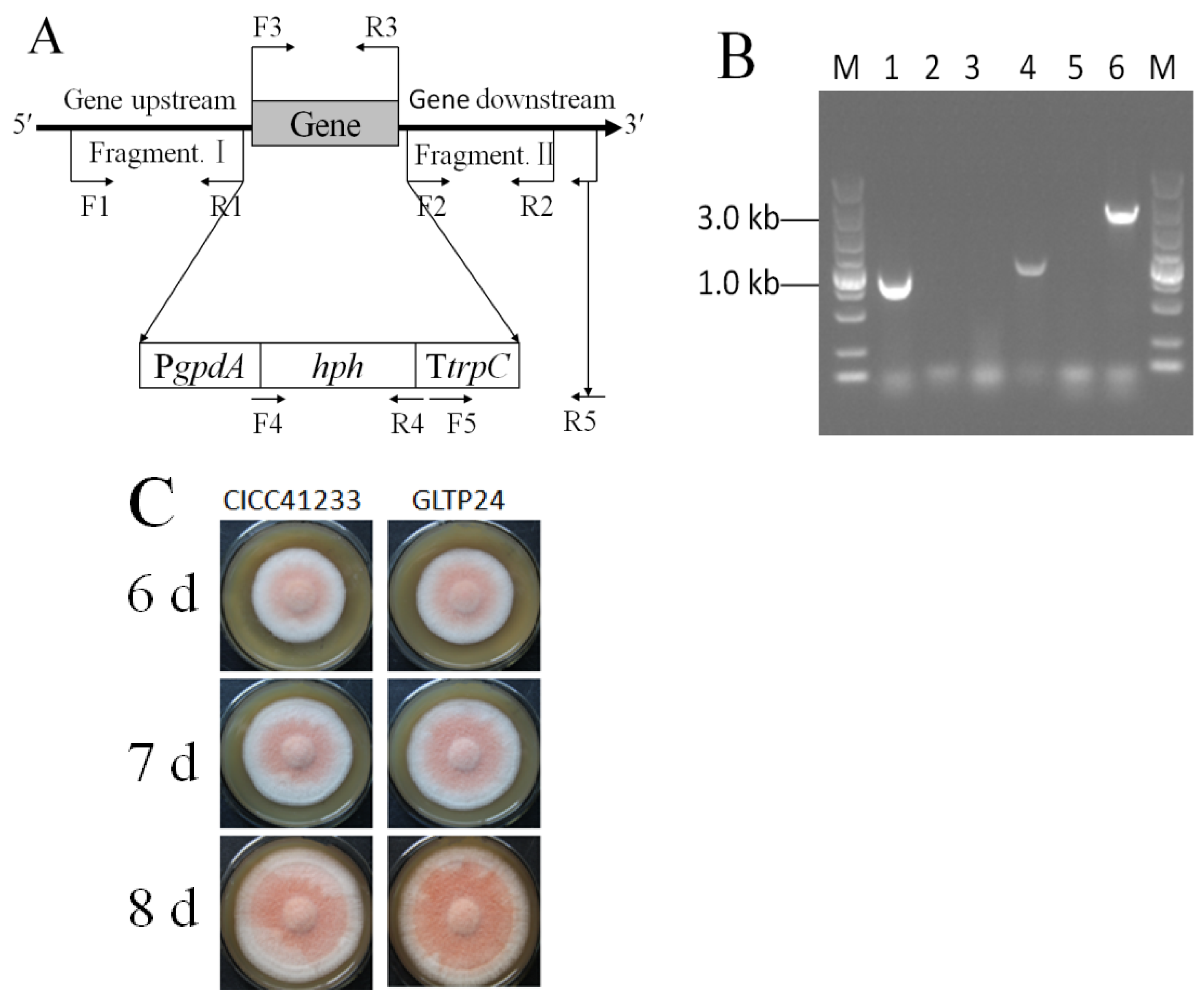 Schematic map of the primer locus for knocking out gltp1 (A) and identification of mutant M. ruber GLTP24 by PCR (B) and phenotype of M. ruber (C). (A) F1, primer G129444-QC-UF-PstI; R1, primer G129444-QC-UR-SacI. F2, primer G129444-QC-DF-BglII; R2, primer G129444-QC-DR-SpeI. F3, G129444-JYF-HindIII; R3, primer G129444-JYR-SacI. F4, primer Hph-1034F; R4, primer Hph-1034R. F5, primer HtrpC-YZF; R5, primer G129444-YZR. (B) The fragments of lanes 1 and 2 were products of the primers F3 and R3 test. The fragments of lanes 3 and 4 were products of the primers F4 and R4 test. The fragments of lanes 5 and 6 were products of the primers F5 and R5 test. Lanes 1, 3, and 5 represent the genomic DNA as the template from the parental strain M. ruber CICC41233; lanes 2, 4, and 6 represent the genomic DNA as the template from the mutaint strain M. ruber GLTP24. M: DL5000 bp DNA Ladder Marker. (C) Phenotype of M. ruber grown on MPS medium.