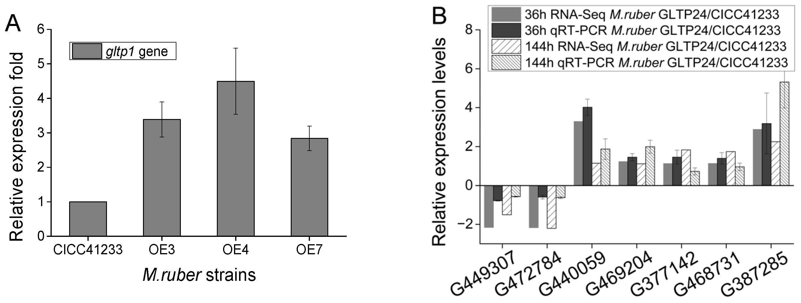 Then, the gltp1 gene was homologously overexpressed in M. ruber CICC41233, and three transformants tested positive, named as M. ruber OE3, M. ruber OE4, and M. ruber OE7 (the molecular identification results were not presented). The gltp1 gene was expressed in the mutant strain M. ruber GLTP24, and three complementary strains tested positive, named as M. ruber HU1, M. ruber HU 6, and M. ruber HU 17 (the molecular identification results are not presented).