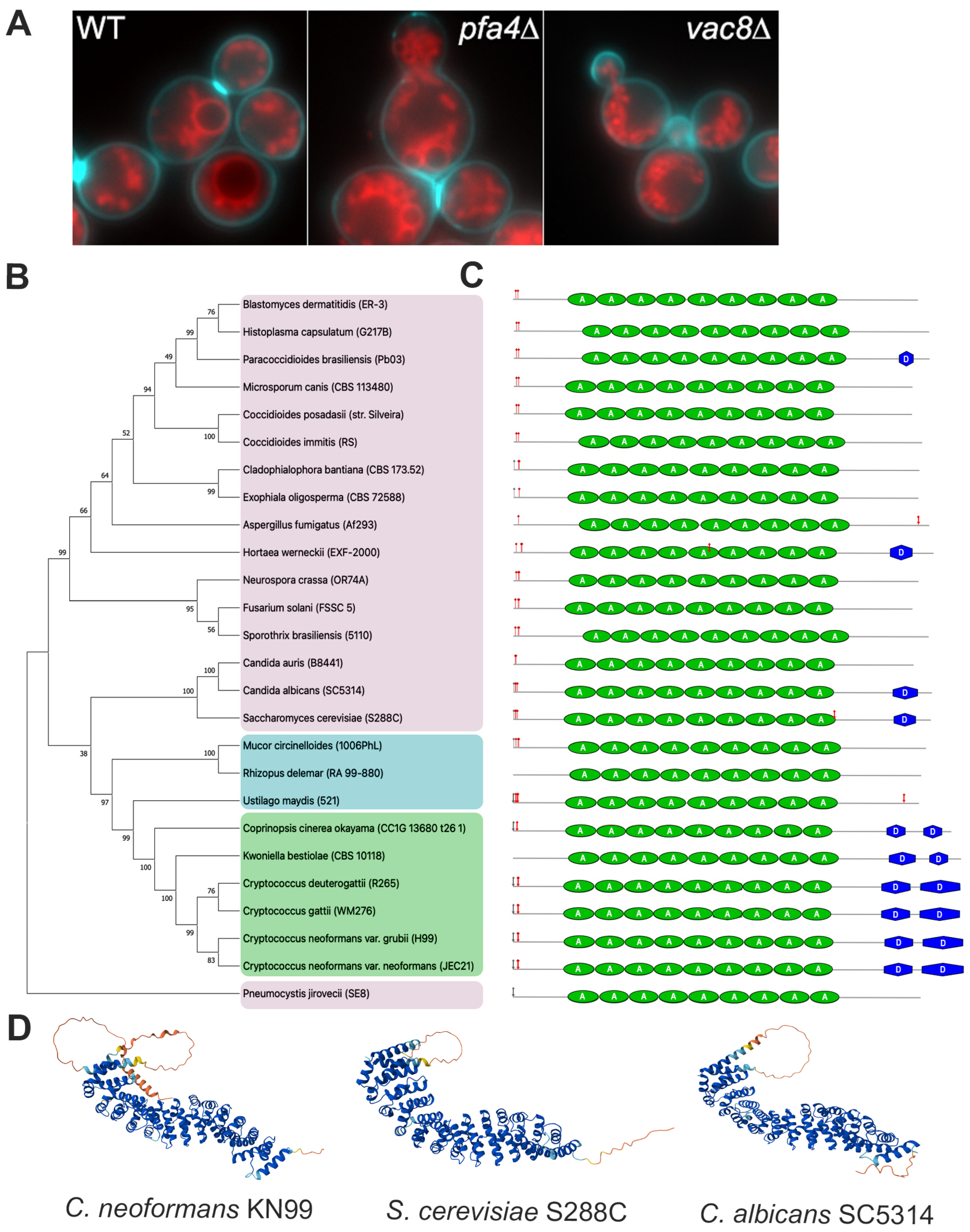 indicates predicted palmitoylation site, green ovals represent armadillo repeat regions, and blue hexagons represent predicted disorder regions. (D) AlphaFold predictions of C. neoformans (AlphaFold ID: AF-J9VIT9-F1), S. cerevisiae (AlphaFold ID: AF-P39968-F1), and C. albicans (AlphaFold ID: AF-Q59MN0-F1) Vac8.