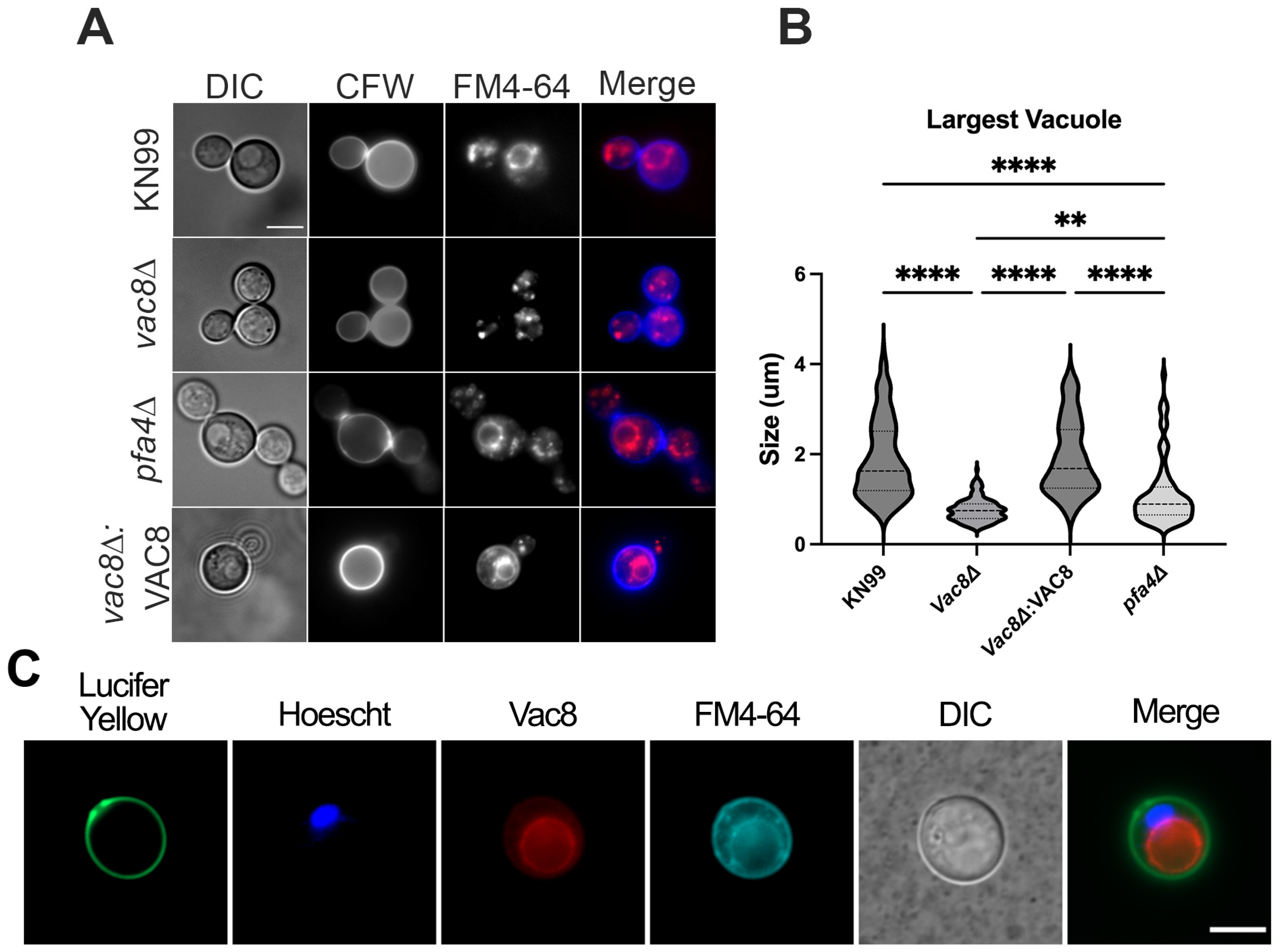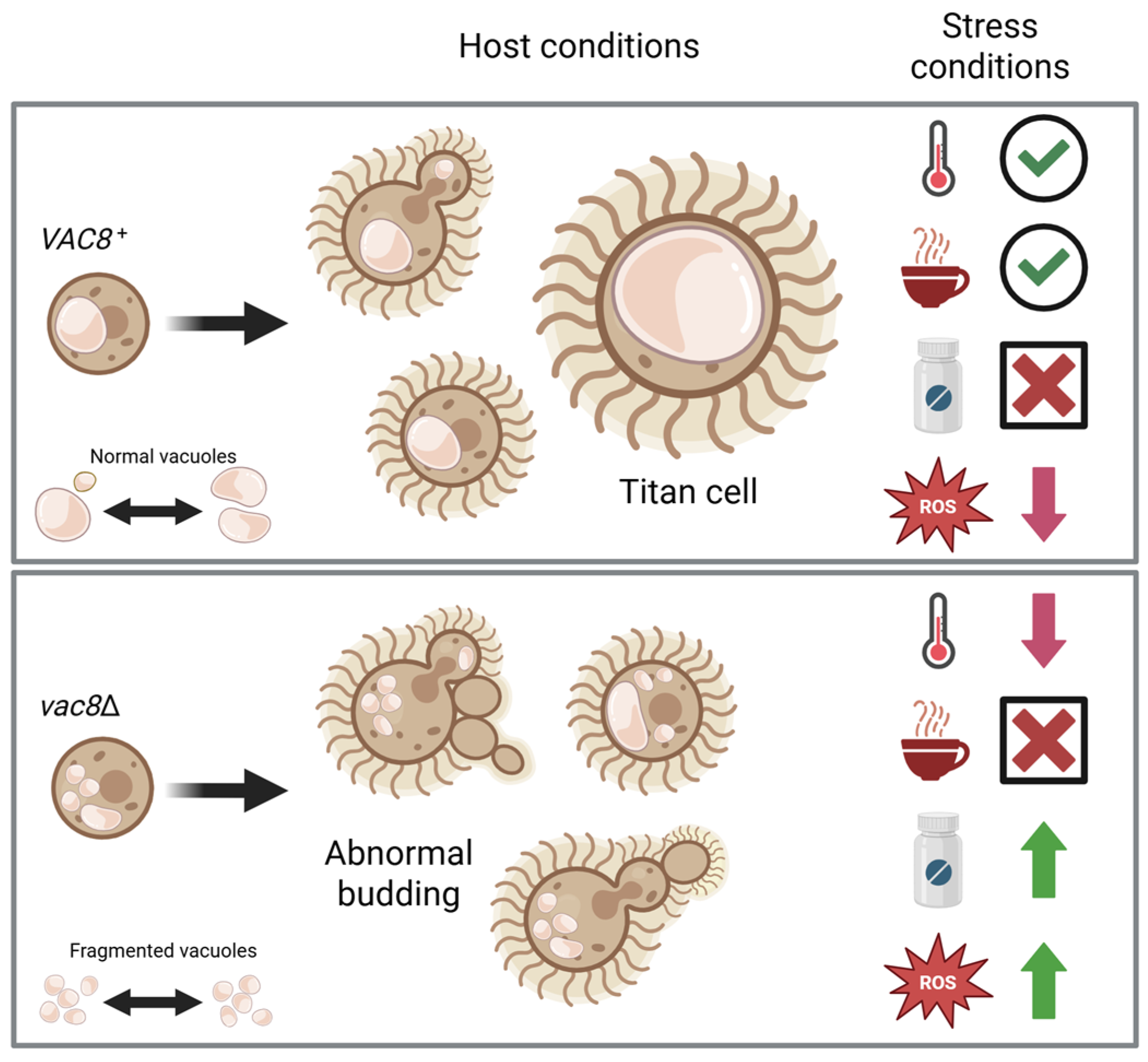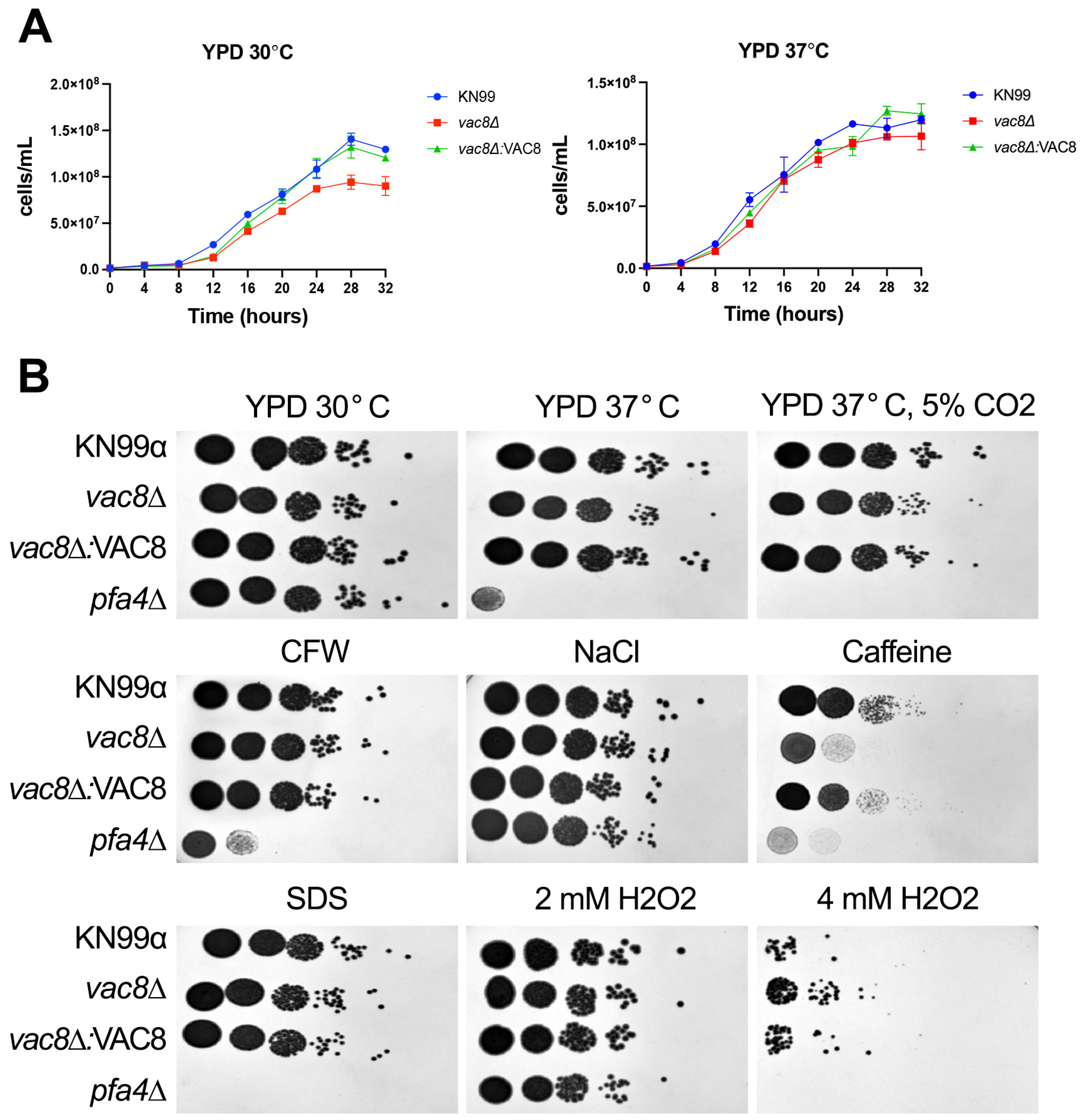 Stuckey, P.V.; Marine, J.; Figueras, M.; Collins, A.; Santiago-Tirado, F.H. The Vacuolar Protein 8 (Vac8) Homolog in Cryptococcus neoformans Impacts Stress Responses and Virulence Traits Through Conserved and Unique Roles. J. Fungi 2025, 11, 877. https://doi.org/10.3390/jof11120877