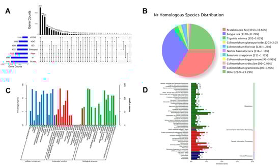 D. carpinicola Genome Annotation. (A) The UpSet plot illustrating the gene annotation discrepancies across seven commonly utilized databases. (B) The distribution map depicting the presence of homologous species in the Nr database. (C) The statistical analysis presenting the GO annotations classification. Abscissa represents classification, and ordinate represents the number and percentage of genes. (D) The statistical analysis presenting the KEGG annotation classification. Abscissa represents annotated genes, and ordinate represents classification.