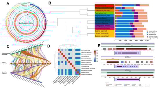 Phylogenetic analyses were performed to elucidate the evolutionary relationship between D. carpinicola and 12 representative Ascomycetes. The NCBI Accession Number of the strains is presented in Table S3. The D. carpinicola formed a cohesive cluster within a branch alongside D. bambusicola and D. eschscholtzii, suggesting a close phylogenetic affinity (Figure 2B). Therefore, D. carpinicola was cultivated and applied in the same way as D. bambusicola [29,30] and D. eschscholtzii [31,32]. Furthermore, the findings revealed that D. carpinicola displayed a pronounced evolutionary relationship with Hypoxylon fuscum, Hypoxylon crocopeplum, Jackrogersella minutella, and D. bambusicola. A total of 3473 single-copy orthologous genes were identified, facilitating phylogenetic reconstruction among the species (Figure 2B).