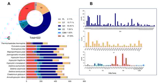 This study identified 522 potential CAZyme genes in the D. carpinicola genome. These included 237 glycoside hydrolases (GHs, 45.40%), 82 glycosyl transferases (GTs, 15.71%), 11 polysaccharide lyases (PLs, 2.11%), 38 carbohydrate esterases (CEs, 7.287%), 144 auxiliary activities enzymes (AAs, 27.59%), and 10 carbohydrate-binding modules (CBMs, 1.92%) (Figure 3A). Figure 3B shows the top 5 GH family genes (21 GH43, 18 GH16, 18 GH18, 17 GH5, and 15 GH3) involved in hemicellulose digestion, contributing to effective degradation in organisms. In addition to GH CAZymes, the D. carpinicola was also abundant in ligninolytic enzymes, suggesting a capacity to degrade both plant cell wall polysaccharides and lignin. The genome comprised seven laccase (AA1), five lignin peroxidase (AA2), and thirty-five auxiliary activity (AA3) encoding genes.