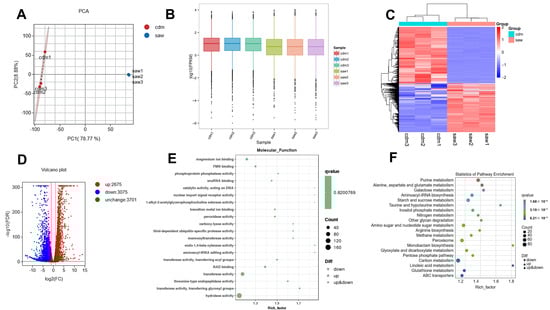 The transcriptomic data have been meticulously curated and subsequently uploaded to the National Center for Biotechnology Information (NCBI) repository under the BioProject Accession Number: PRJNA1209598. In transcriptome analysis, the cdm group acted as the control group and the saw group served as the treatment group. The PCA analysis indicated minor differences between the cdm and saw repeat samples, suggesting a low repeatability error for these samples. Furthermore, it illustrated a clear separation between the cdm and saw groups in the PC1 score plots, indicating a significant difference between the two groups (Figure 4A). The box plot (Figure 4B) illustrated that gene expression levels across the six samples were similarly dispersed, ranging from −6 to 4. It was evident that the parallel samples in the cdm and saw groups exhibited both strong correlations and significant differences.