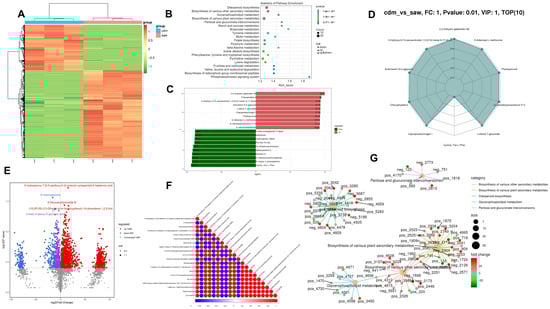The metabolomic data have been meticulously compiled and are presented in the Supplementary Materials. In the metabolomics analysis, the cdm group acted as the control group and the saw group served as the treatment group. A total of 41.91 Gb of clean data were obtained from metabolome analysis, and 11,212 peaks were detected, of which 2912 metabolites were annotated. The metabolomic heatmap was analyzed to evaluate the DEGs clustering in the samples. The results showed significant correlations, substantial differences, and clear enrichment between the DEMs of the two parallel sample groups (Figure 5A). OPLS-DA analysis showed that the model was stable and reliable, making it suitable for DEMs screening (Figure S2a).