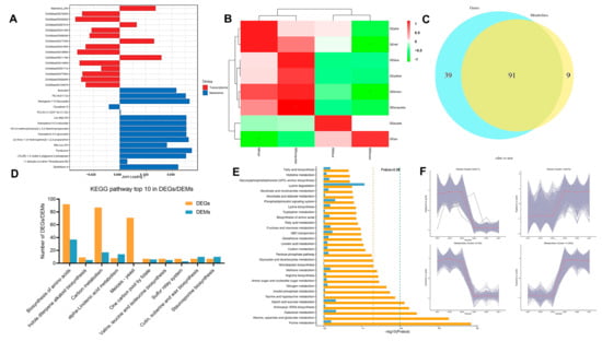 The Venn diagram revealed that 130 pathways were associated with transcriptomic DEGs, while 100 were related to metabolomic DEMs, showing overlapping between 91 pathways (Figure 6C). The top ten KEGG pathways with the highest number of identified DEGs and DEMs were visualized, including amino acid, indole diterpene alkaloid, valine, leucine, isoleucine, cutin, suberine, and wax biosynthesis, carbon and alpha-linolenic acid metabolism, yeast meiosis, and one-carbon pool via folate (Figure 6D). The top 30 most significantly enriched pathways complemented and supported analysis result of the top 10 KEGG pathways (Figure 6E). The intersection of the metabolic pathways identified by the two statistical KEGG methods included amino acid biosynthesis and carbon metabolism.