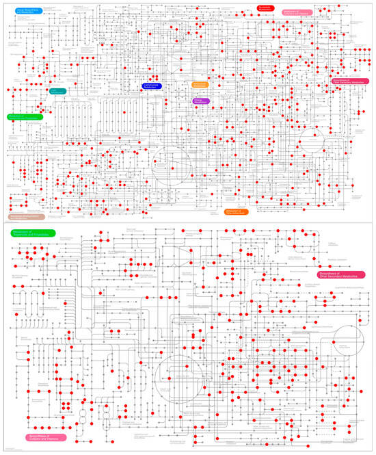 Ipath map of combined transcriptomic and metabolomic analysis. The nodes denote various compounds, while boundaries signify distinct enzymatic reactions. The red dots indicate reactions where DEGs/DEMs were identified, while the variety of lines illustrates different metabolic pathways or functions.