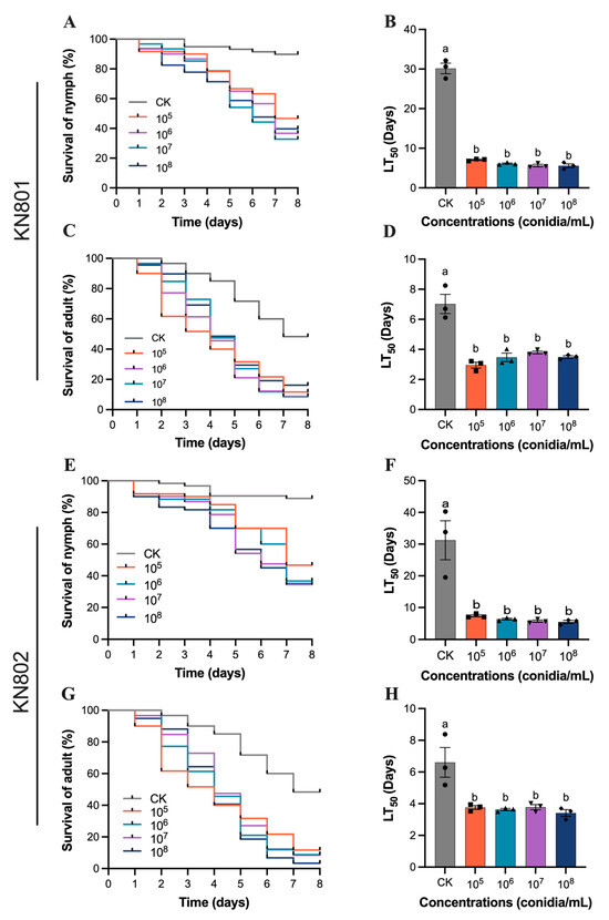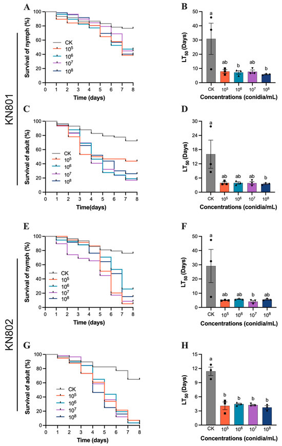 The susceptibility evaluation of B. bassiana strains KN801 and KN802 to N. lugens. (A,B) the survival rate and LT50 of B. bassiana KN801 to N. lugens nymph. (C,D) the survival rate and LT50 of B. bassiana KN801 to N. lugens adult. (E,F) the survival rate and LT50 of B. bassiana KN802 to N. lugens nymph. (G,H) the survival rate and LT50 of B. bassiana KN802 to N. lugens adult. The error bars indicate the Standard error (SE) in the graphs. Different letters indicate a significant difference with p < 0.05.