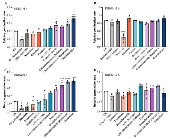 The compatibility of B. bassiana strains KN801 and KN802 with insecticides. (A,B) the relative germination of B. bassiana KN801 mixed with insecticides at 6 and 12 h. (C,D) the relative germination of B. bassiana KN802 mixed with insecticides at 6 and 12 h. The error bars indicate the Standard error (SE) in the graphs. An asterisk “*” indicates a significant difference between two treatments with p < 0.05, “**” indicates a significant difference between two treatments with p < 0.01, “***” indicates a significant difference between two treatments with p < 0.001, “****” indicates a significant difference between two treatments with p < 0.0001.