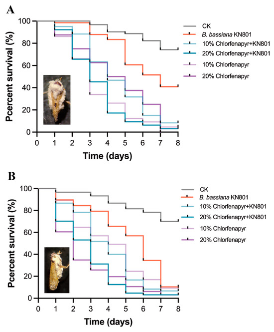 Effects of combined use of B. bassiana KN801 and insecticide chorfenapyr for S. furcifera and N. lugens adults. (A) the survival of S. furcifera after treating with combined use of B. bassiana KN801 and chlorfenapyr. (B) the survival of N. lugens after treating with combined use of B. bassiana KN801 and chlorfenapyr.