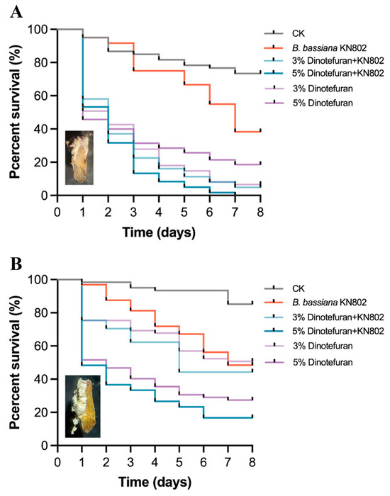 Effects of combined use of B. bassiana KN802 and insecticide dinotefuran for S. furcifera and N. lugens adults. (A) the survival of S. furcifera after treating with combined use of B. bassiana KN802 and dinotefuran. (B) the survival of N. lugens after treating with combined use of B. bassiana KN802 and dinotefuran.