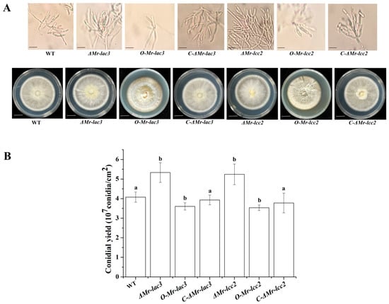 Conidiophores and conidial yields of the disruption, overexpression, and complementation strains of Mr-lac3 and Mr-lcc2. (A). Top panel of the upper picture: Conidiophores were observed at 3 days post inoculation by spraying 100 µL of a conidial suspension (1 × 107 conidia mL−1) on the PDA plate. Bottom panel: Colony morphology of the WT, disruption, overexpression, and complementation strains. Colony pictures were taken at 15 days post inoculation by applying 5 µL of a conidial suspension (1 × 107 conidia mL−1) onto the center of a PDA plate (diameter 9 cm). Bar, 1 cm. (B). Conidial yields of the WT, disruption, overexpression, and complementation strains. Conidial yields were measured at 15 days post inoculation by spraying 100 µL of a conidial suspension (1 × 107 conidia mL−1) onto the PDA plate. Values with different letters are significantly different (p < 0.05). Conidial yields were repeated three times with three PDA plates (diameter 9 cm) per repeat.